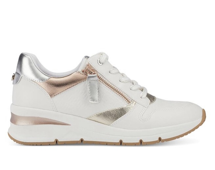 Bestseller! Úžasné sneakers na klínku od Tamaris. Klínek Vám přidá výšku a prodlouží nohy a přesto ho vůbec neucítíte, obuv je krásně pohodlná. Efektní zip vedle zavazování. Módní bílé provedení s metalickým zdobením.