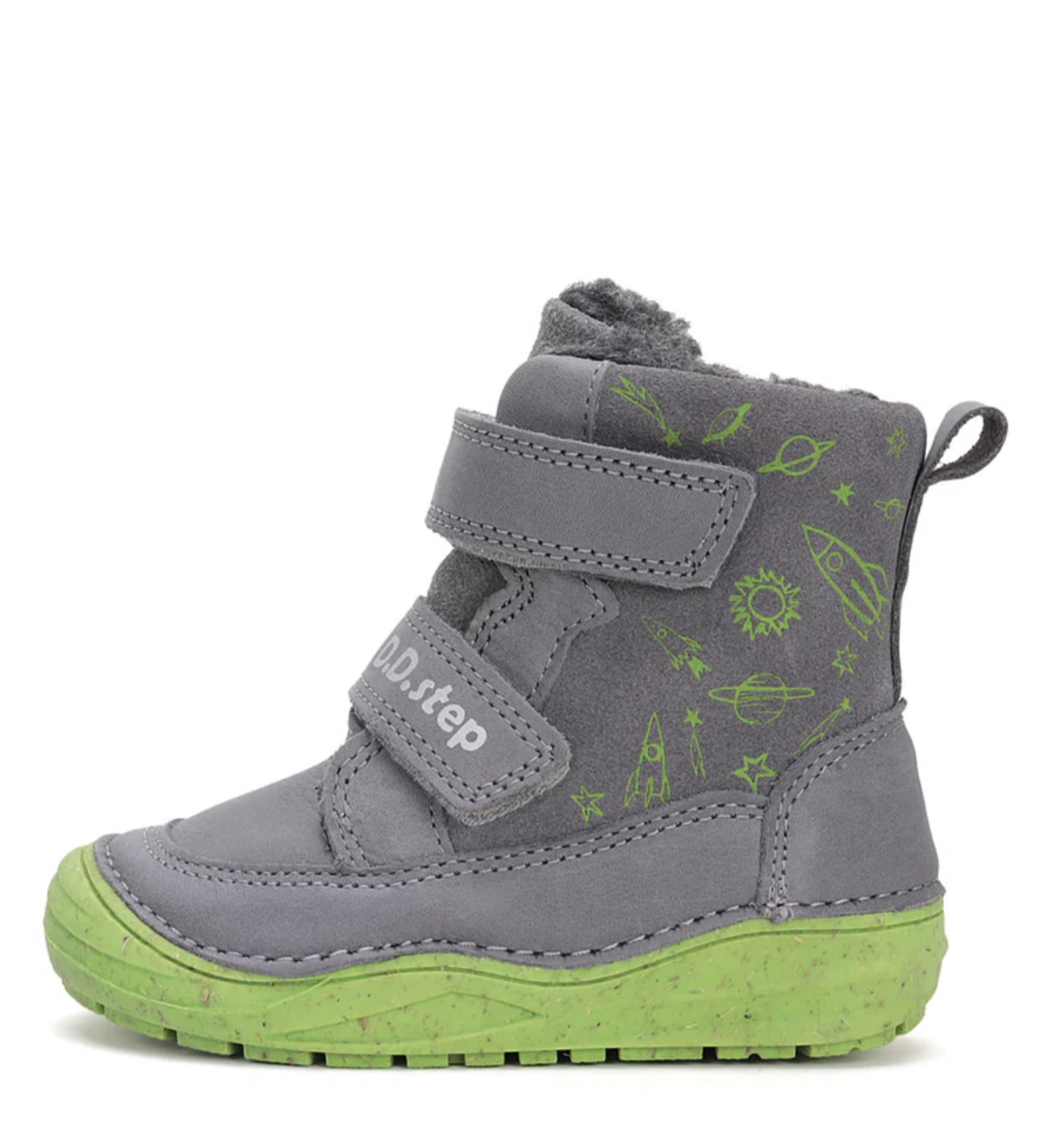 Dětské zimní boty značky D.D.step z pravé kůže jsou velmi lehké a ohebné. Předností je vkládací stélka, která napomáhá snadné kontrole velikosti. Vnitřní část zateplena hřejivým kožíškem, pevný opatek v patní části. Špice chráněna proti okopům. Zapínání na suchý zip.