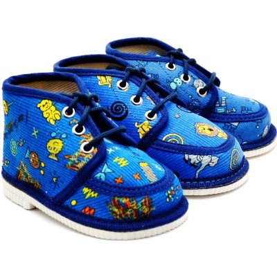Bačkorka je z bavlněné tkaniny. Podešev bačkorky je styroporová, certifikovaná žirafou. Tato bačkorka sahá nad kotníky, je klasickým typem bačkorky pro děti od 1 roku do 3 let. Šněrování bačkorky společně se zpevněným opatkem zaručuje pevné zafixování nohy v botičce a tím se docílí správného postavení nohy. Výroba v ČR.