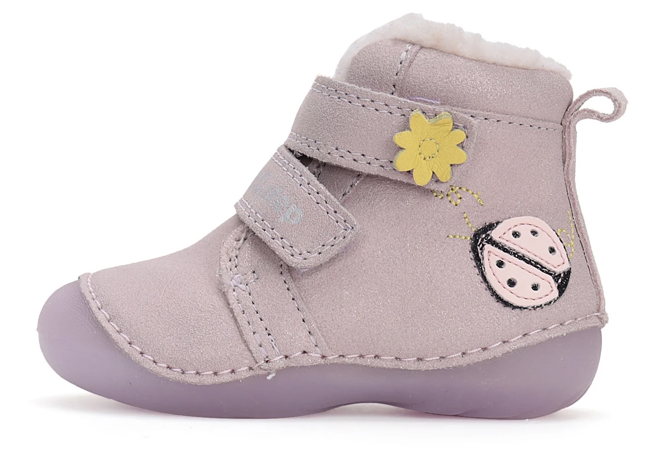 Zimní kožené boty s motivem berušky na světle fialovém podkladu.
