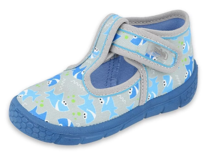 Textilní kotníkové bačkůrky osvědčené značky Befado, důmyslně vymyšlená podešev, která je přetažena přes špici a tím ji chrání. Zapínání na jeden suchý zip.