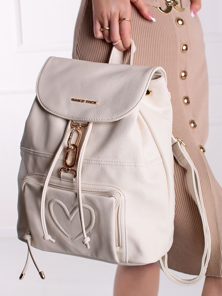 Batůžek v moderním zpracování v béžové barvě se zlatými detaily. Batůžek má klopu a pod ní je hlavní kapsa s kapsičkami na uložení drobností. Batůžek má v přední části jednu menší kapsu na zip.