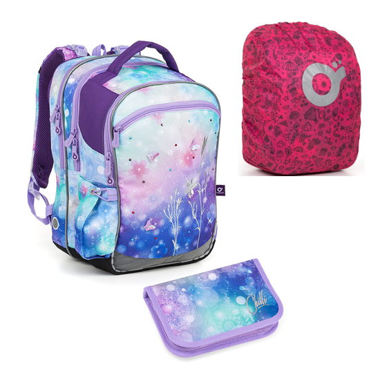 Batoh je oděn do krásných modro-fialových odstíhů doplněných stříbrnou výšivkou, motýlky a třpytkami, co ocení hlavně romanticky laděné děvčátka.
