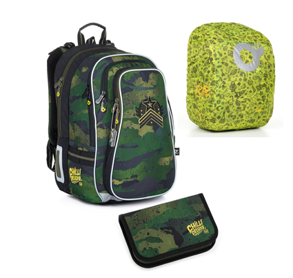 SET Školní batoh s penálem a pláštěnkou TOPGAL LYNN 21018 vojenský