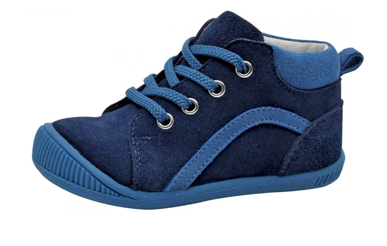Chlapecké modré capáčky, které jsou vhodné již při prvních krocích. Boty mají ohebnou podrážku, která má tmavě růžovou barvu s jemným leskem a je vyvýšená v přední části. Díky tomu se předejde rychlému kolempání bot.