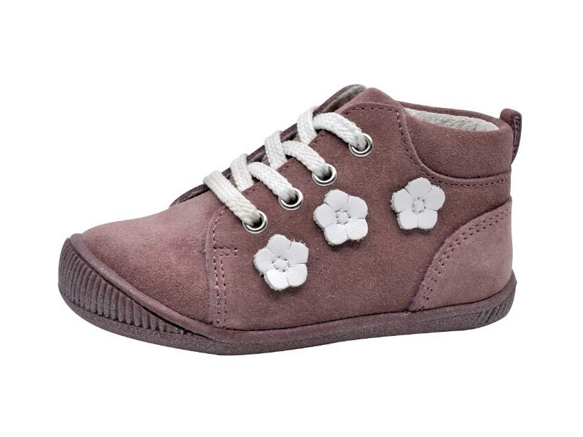 Svršek je z broušené kůže starorůžové barvy. Vnitřek je také kožený, kůže je bílé barvy. Stélka je také kožená. Je také vyjímatelná a má prvek na podporu přirozeného vývoje nožní klenby. Na jednom boku bot se nachází aplikace 3 bílých kožených kvítků.