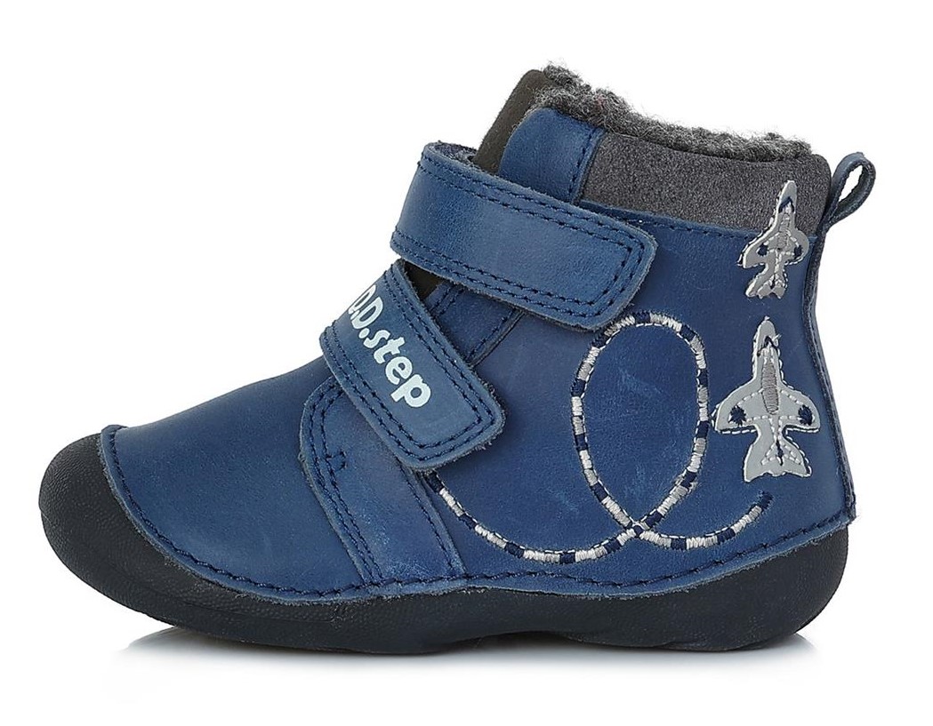 Kvalitní, teplé a dobře se obouvající botičky. Dětské zimní boty D.D. step z kompromisní/barefoot řady v modré barvě a motivem letadla na vnější straně. Boty jsou lehce nadkotníkové, uvnitř mají teploučký kožíšek. Velmi měkká a ohebná podrážka, krásně se přizpůsobí v chůzi, proto je vhodná i pro ty nejmenší chodce. Špička i pata je vyvýšená, chrání proti okopu. Díky dvěma suchým zipům lze boty krásně rozevřít, usnadňují tedy obouvání a dají se přizpůsobit v oblasti nártu i kotníku. Boty jsou z hladké kůže, kterou lze snadno otřít, a snadno se tak udržují.